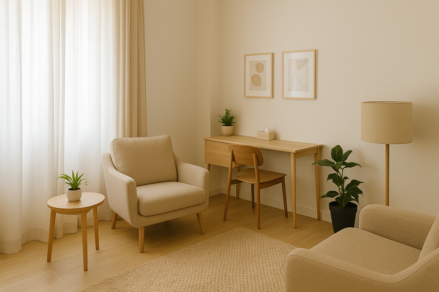Sala de 12 m² com luz natural, cadeiras, secretária e sofá/divã. Ideal para sessões terapêuticas individuais.